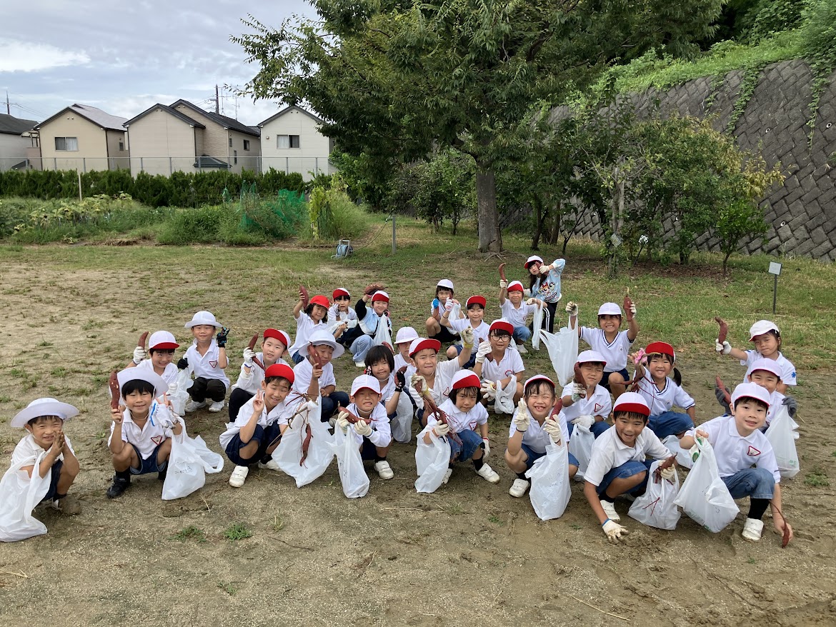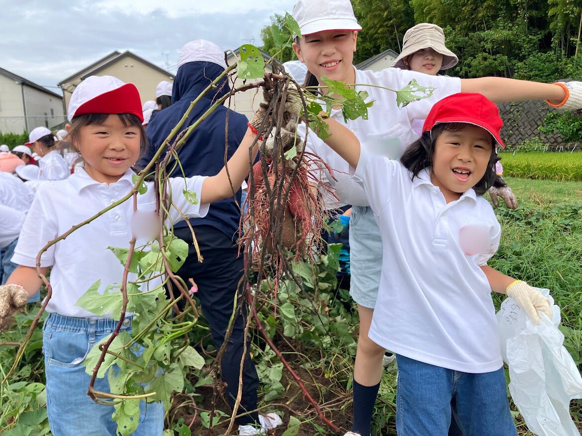 1年生は5年生と5月にいっしょに苗を植え、夏の間、水やりや草抜きをしながら大切に育ててきました。猛暑の影響で収穫量は少なめでしたが、子どもたちは土の中から見つけたいもに大喜び。自然の恵みを感じる一日になりました。