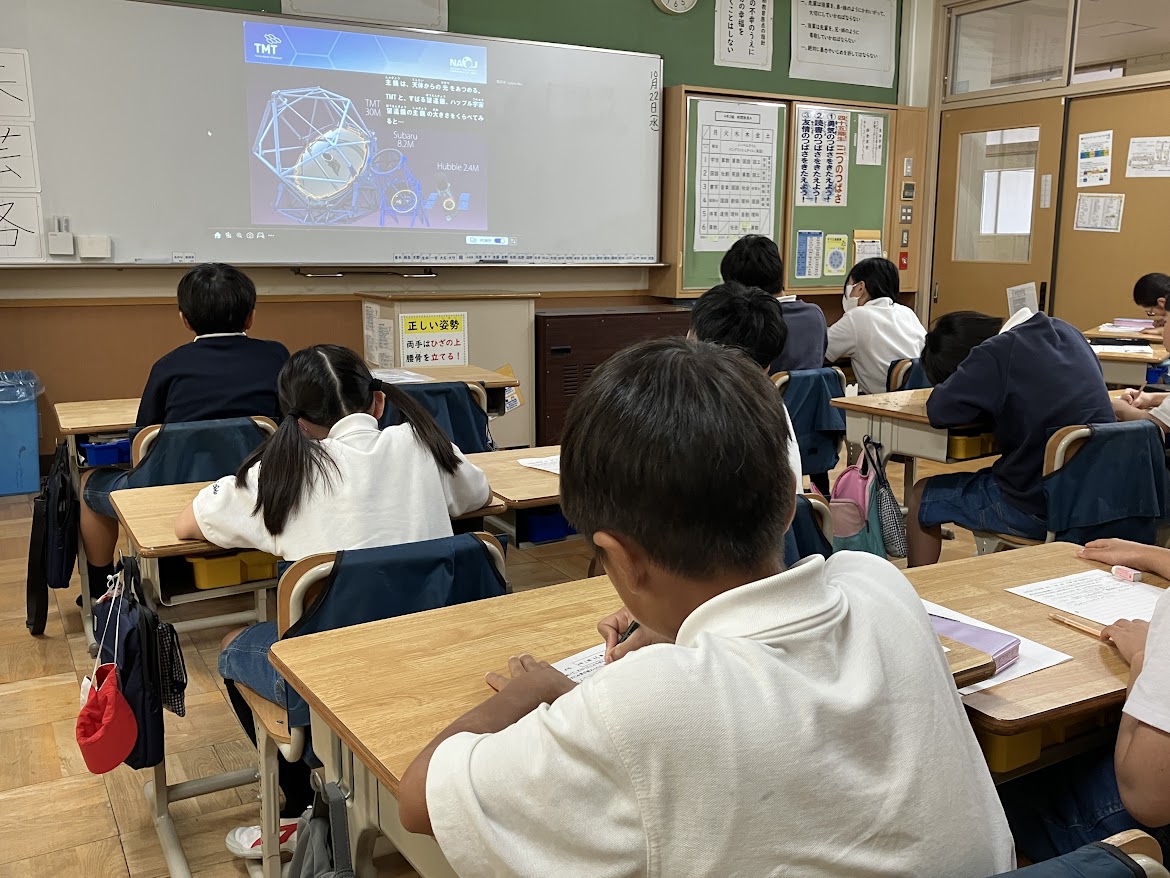 子どもたちは、理科の学習で宇宙や星について調べ、疑問に思ったことをまとめて事前に質問を送りました。当日は、講師の先生の話を熱心に聞きながらメモを取り、星の動きや宇宙の広がりに驚きと関心を寄せていました。