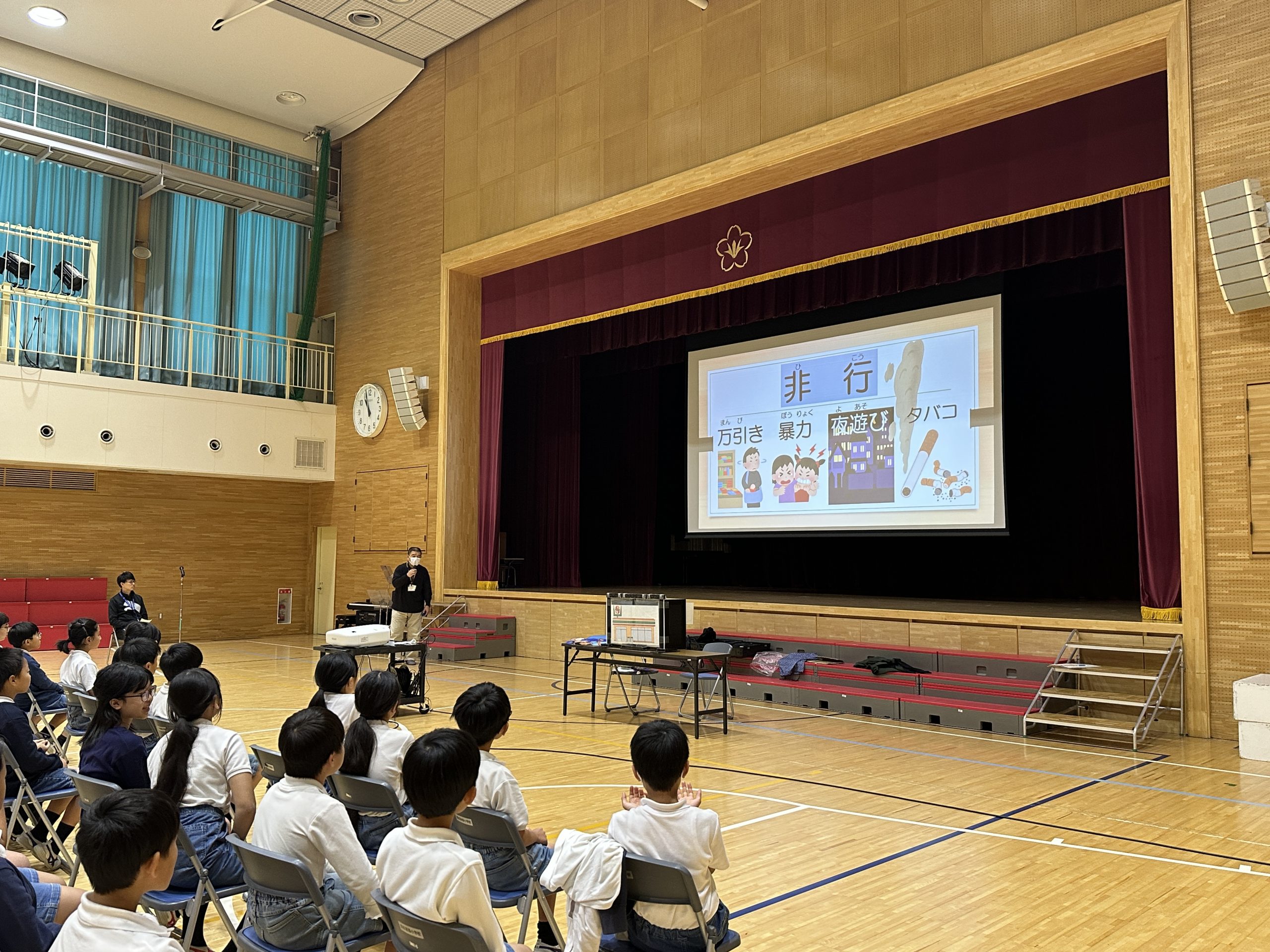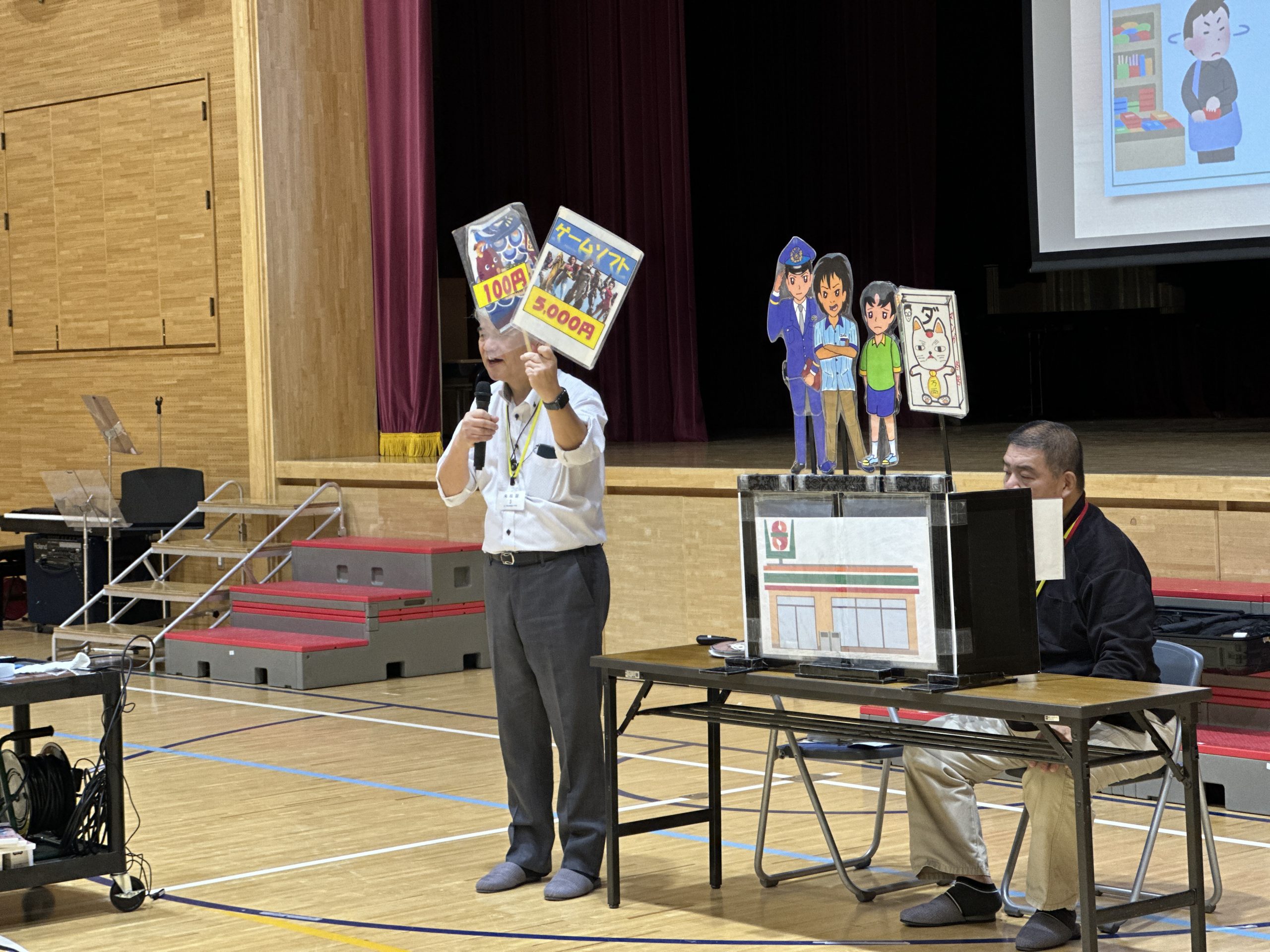 10月28日(火)に、5年生が池田体育館で、枚方青少年サポートセンターの方々に来ていただき、「非行防止・犯罪被害防止教室」を行いました。講師の方々は、「みんなに、絶対に犯罪をしたり、犯罪に巻き込まれたりしてほしくない!」との思いで、紙芝居をしながら、万引きは絶対にいけないということを、話してくださいました。