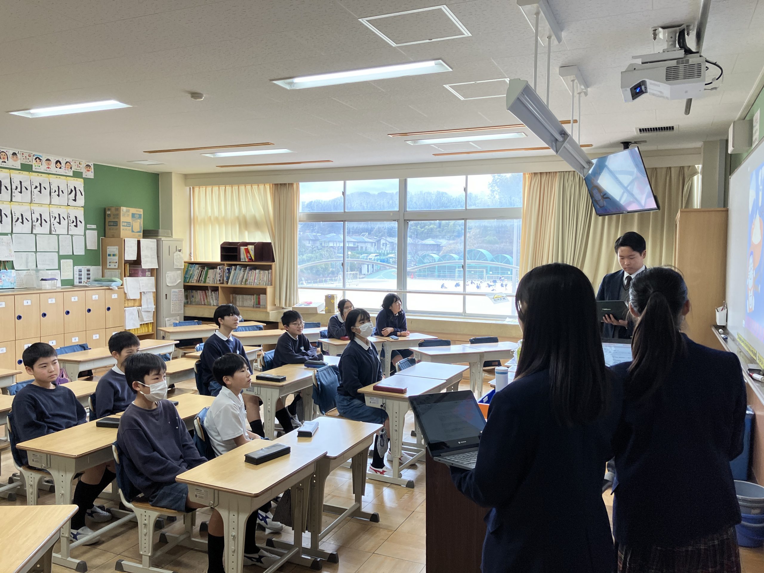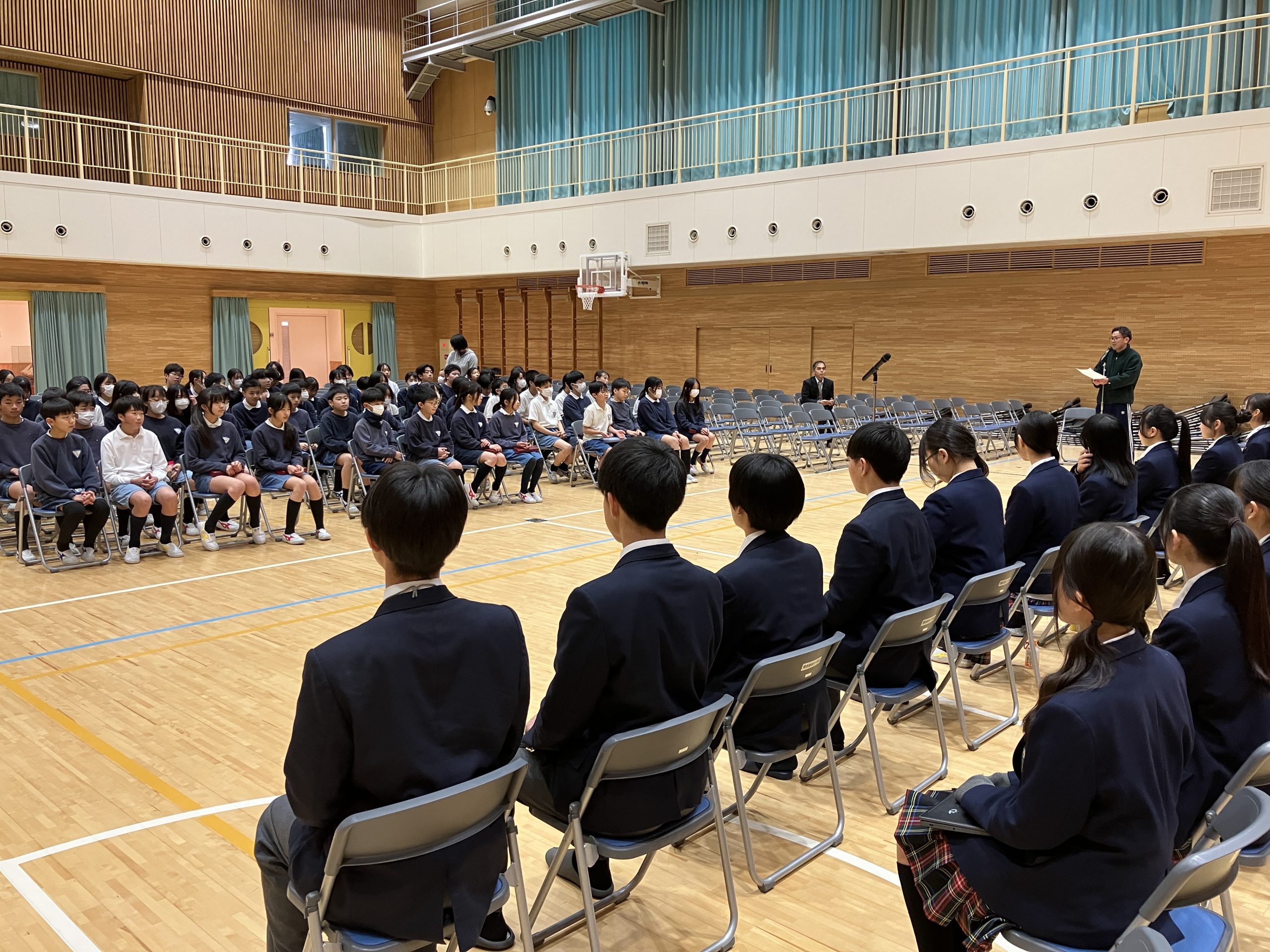 事前に児童から中学生に聞いてみたいことをアンケートで集め、その内容をもとに9つのテーマに分けて、先輩方がプレゼンテーションをしてくださいました。家庭学習の工夫や部活動との両立、海外研修の体験談など、具体的で分かりやすいアドバイスに、児童たちは熱心に耳を傾けていました。